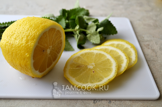 Лимон промойте с содой под горячей водой. Нарежьте с кожурой на кружочки. Веточки мелиссы тщательно промойте.
