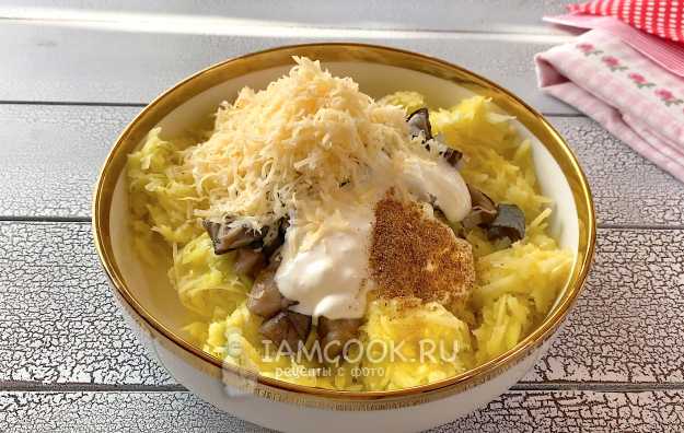 Добавьте сметану, 1/2 тертого сыра, соль, специи и хорошенько перемешайте.