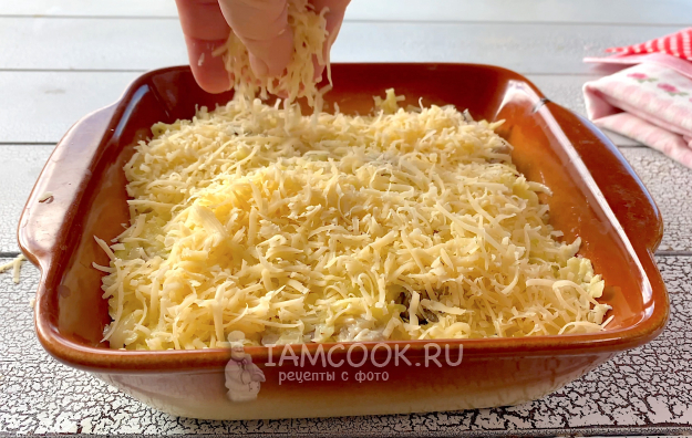 Выложите в жаропрочную форму. Сверху посыпьте тертым сыром. Запекайте в разогретой до 190 градусов духовке минут 30-35.