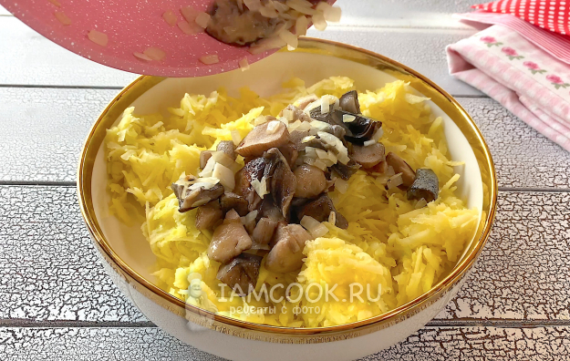 Лесные грибы очистить от загрязнений, промыть и отварить в подсоленной воде в течение 20 минут. Если будете использовать шампиньоны или вешенки, их не нужно предварительно варить.