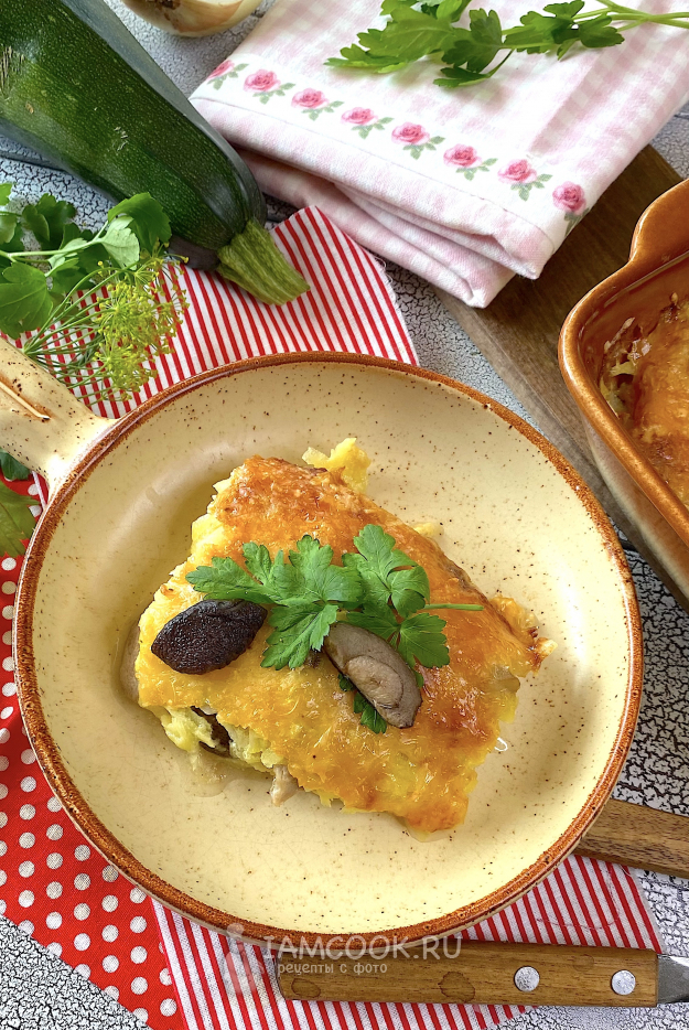 Для начала подготовим все необходимые продукты для запеканки из кабачков с грибами и сыром.
