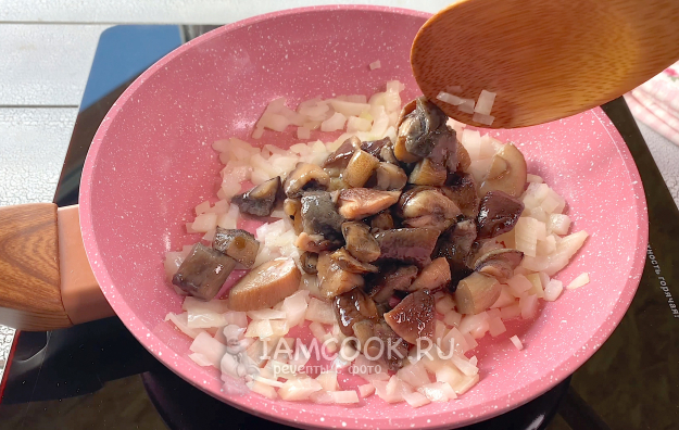 Нарежьте репчатый лук на небольшие кусочки и обжарьте на сковороде с растительным маслом до мягкости. Добавьте грибы и обжарьте, помешивая, на среднем огне примерно минут 10.