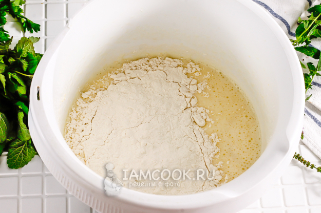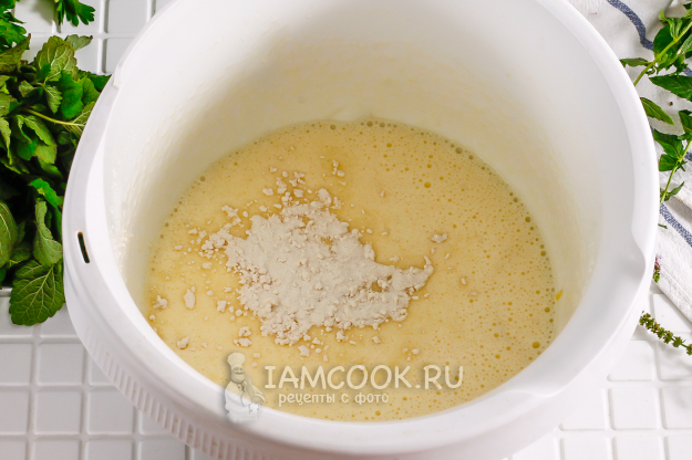 Следом добавьте пшеничную муку высшего сорта и аккуратно вмешайте ее в тесто с помощью венчика или силиконовой лопатки.