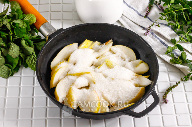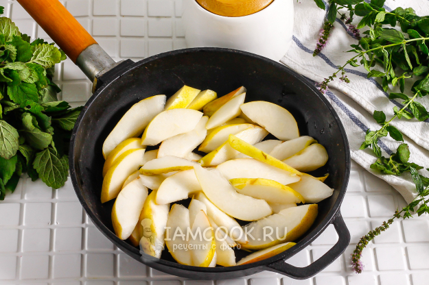 Груши промойте в воде, нарежьте на части и срежьте с них семенные блоки. Промойте мякоть и обсушите салфетками. Нарежьте дольками и выложите в сковороду с прочными стенками или в ковш с антипригарным дном.