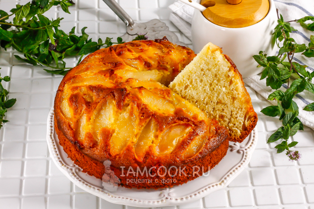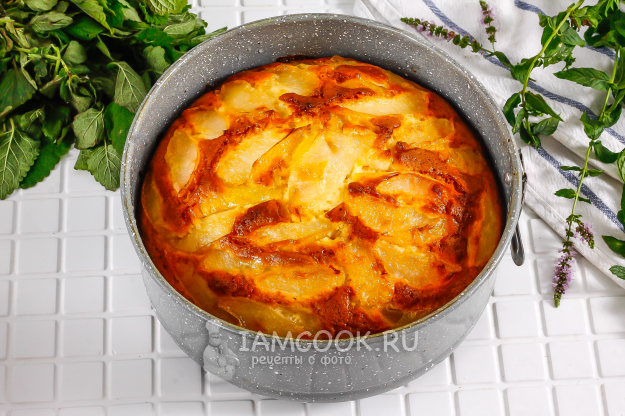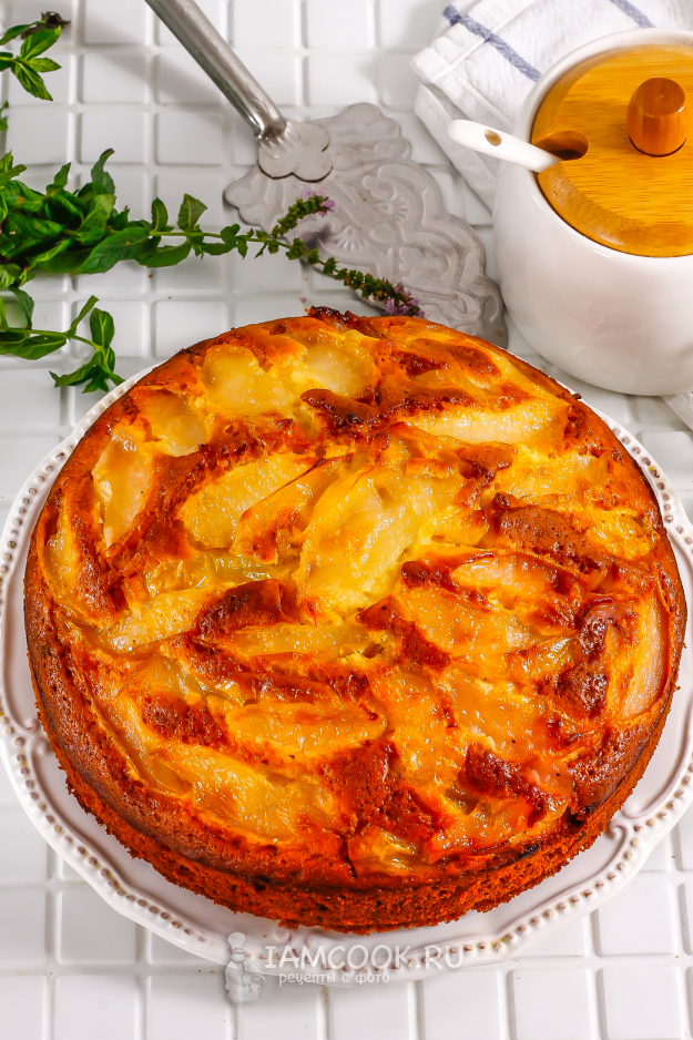 Отправьте форму в духовку на 30-35 минут. Готовность пирога проверьте деревянной шпажкой, проткнув ею выпечку насквозь. Если шпажка выйдет сухой, значит, пирог с карамелизированными грушами полностью готов и можно выключить нагрев.