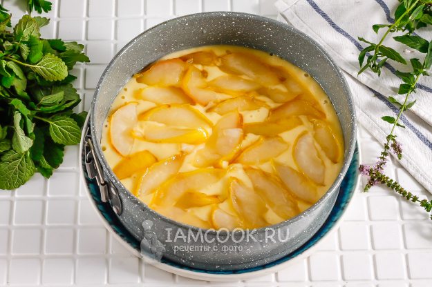 Форму смажьте растительным маслом и выложите в нее густое тесто. Сверху вилкой выложите ломтики карамелизированных груш. Сироп вам не потребуется, им вы можете полить пирог уже после выпекания.