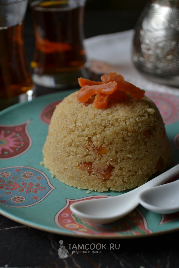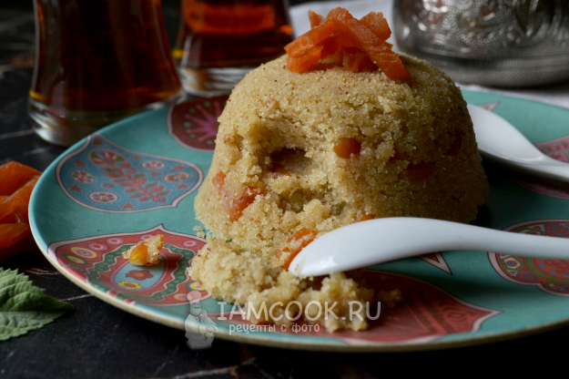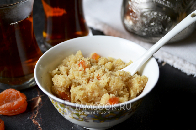Халва из манки с курагой готова. Пиалу с охлажденной халвой накройте тарелкой и переверните. Можно заваривать чай и приглашать к столу своих любимых.