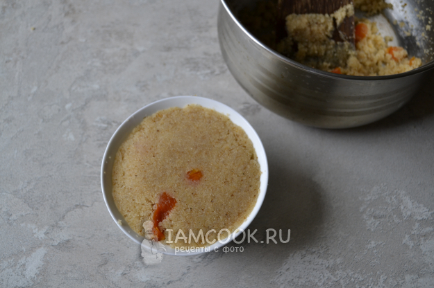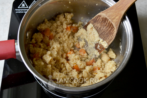 Добавьте к обжаренной манке нарезанную на мелкие кусочки курагу. Если необходимо, то заранее залейте курагу холодной водой на несколько минут для набухания.