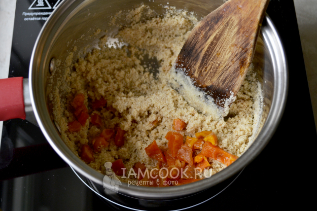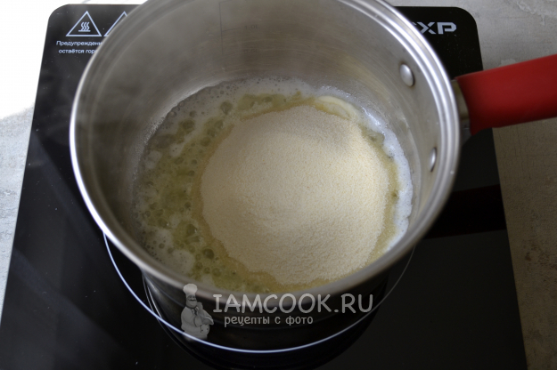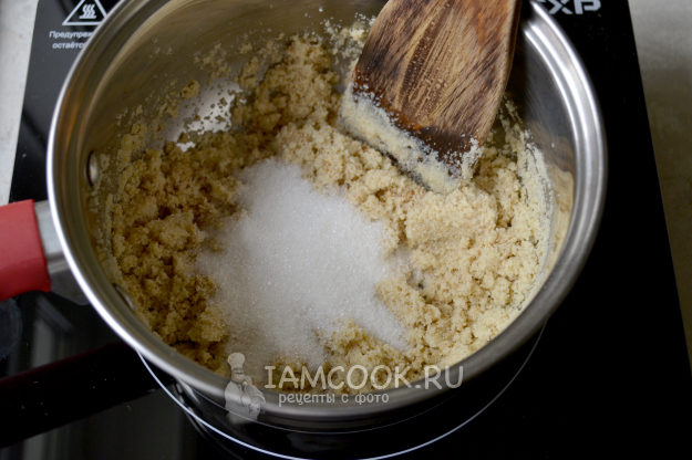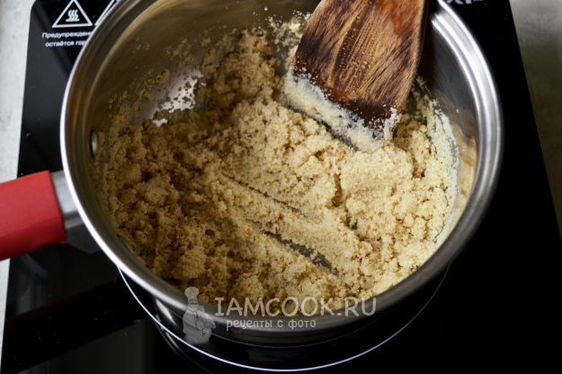 Энергично перемешайте манку с маслом и продолжайте обжаривать на сильном огне еще 5-6 минут, чтобы цвет крупы стал светло-коричневым и от манки пошел приятный аромат. Во время обжаривания обязательно перемешивайте манку. Лучше это делать деревянной лопаткой.