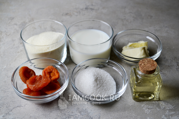 Подготовьте продукты для приготовления халвы из манки. Вместо кураги можно использовать орехи, мак, изюм, кунжут.