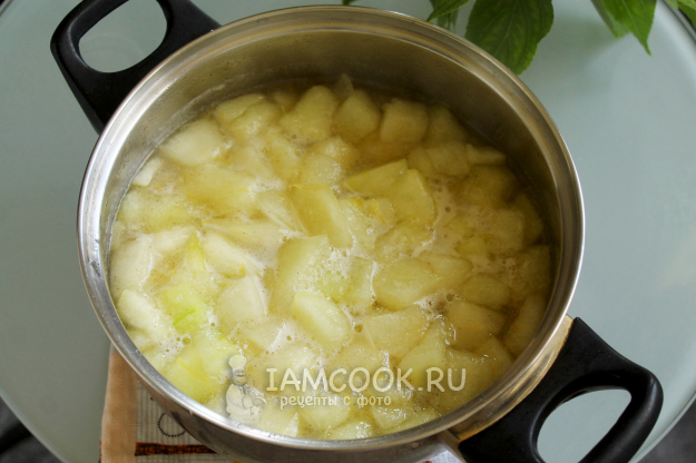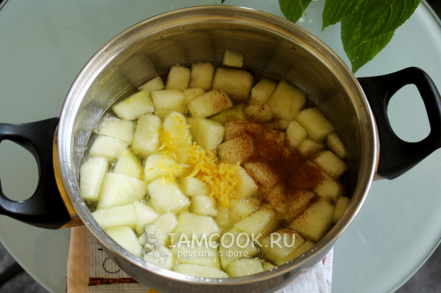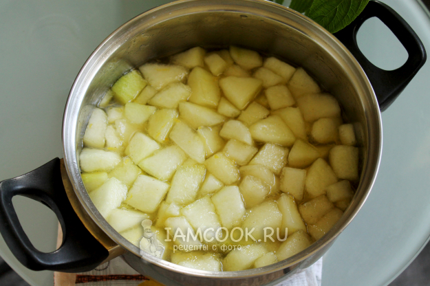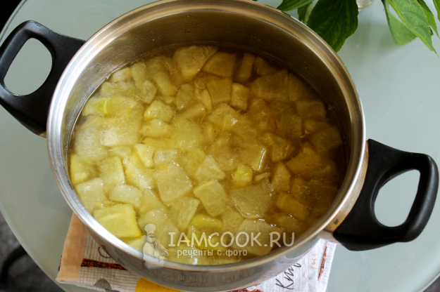 В горячий сироп загрузите кусочки дыни. Нарезайте примерно одним размером.