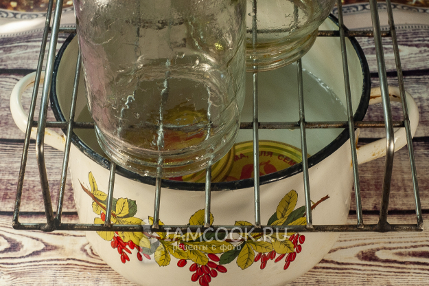 За это время можно простерилизовать банки, предварительно тщательно вымыв их с содой. Банки я стерилизую на решетке, которую устанавливаю над кастрюлей с кипящей водой. Крышки стерилизую, поместив их в ту же кастрюлю.