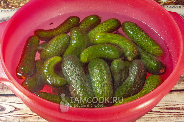 Огурчики замочим на несколько часов в холодной воде, чтобы придать им свежести.