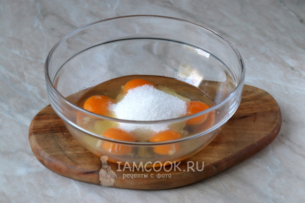 Яйца вбейте в глубокую миску и добавьте к ним сахарный песок.