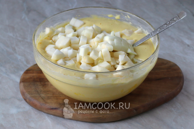 Яблоки очистите, удалите семенную коробочку, а мякоть нарежьте средними кубиками. Фруктовую нарезку добавьте в тесто и снова перемешайте.