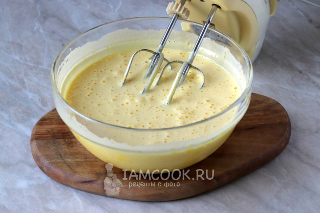 Взбейте миксером до получения пышной светлой массы. На данном этапе можно добавить чайную ложечку ванильного сахара или ванилин на кончике ножа.