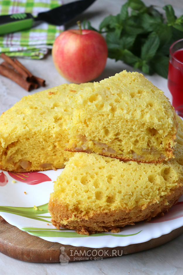 Возьмите продукты для приготовления пышного бисквита с яблоками в мультиварке.