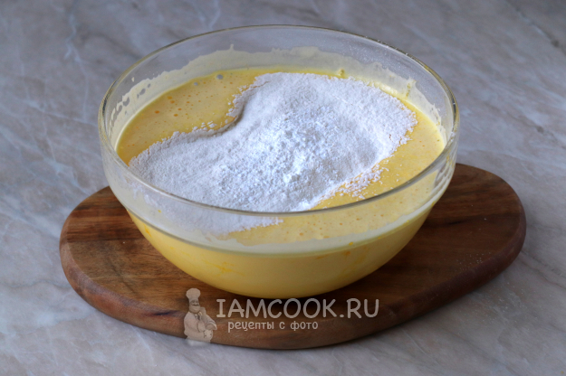 Всыпьте просеянную и смешанную с разрыхлителем муку и аккуратно перемешайте по направлению снизу вверх, стараясь максимально сохранить воздушность теста.