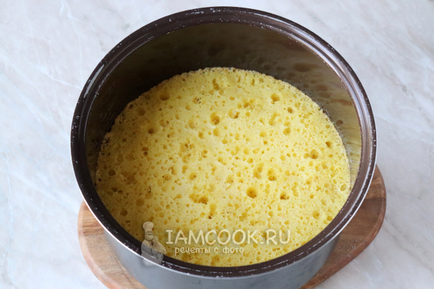 Чашу мультиварки застелите пергаментом или смажьте сливочным маслом и переложите туда бисквитное тесто. Поверхность разровняйте.
