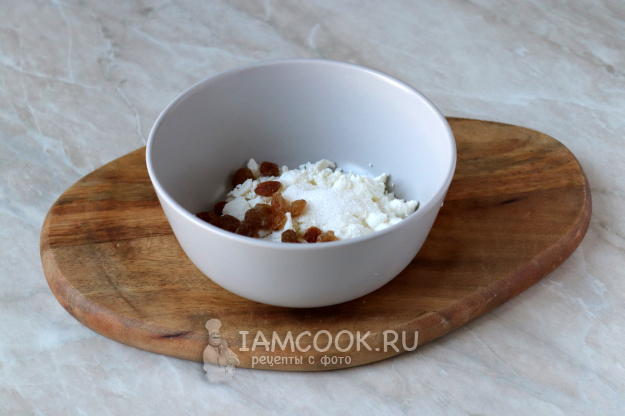 Творог соедините с сахарным песком и тщательно разомните вилкой, затем добавьте подготовленный ранее изюм и снова перемешайте.