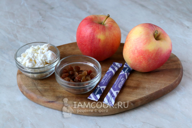 Для приготовления запеченных яблок с творогом в микроволновке подготовьте необходимые компоненты по списку.