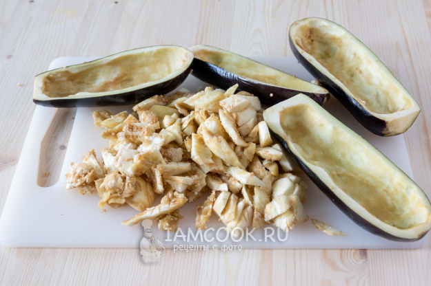Приступим. Разрежьте баклажаны пополам. А затем из каждой половинки удалите мякоть баклажана. Мне удобно это делать ложкой для мороженого, но это можно сделать и обычной ложкой.