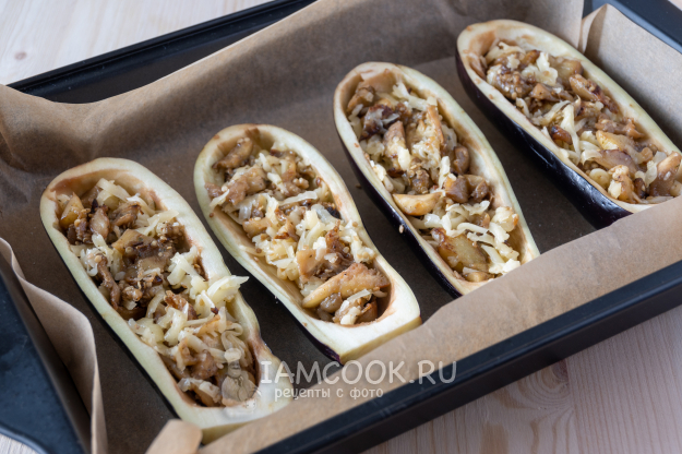 В форму для запекания (по желанию можно застелить пергаментом) выложите половинки баклажанов и слегка их присолите. Наполните баклажаны начинкой и поставьте запекаться в духовку при 180°С минут на 15-20.