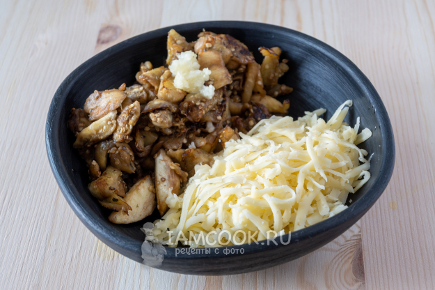 Натрите на тёрке сыр и измельчите чеснок. Добавьте к ним слегка остывшие жареные баклажаны. Перемешайте начинку.