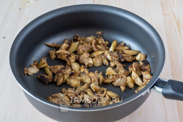 Саму мякоть баклажана нарежьте на небольшие кусочки. И обжарьте на разогретой сковороде с маслом на среднем огне около 5-10 минут. Под конец жарки слегка поперчите и посолите баклажаны, а также добавьте ваши любимые специи при желании (но можно и без них).