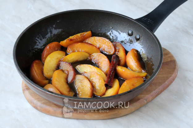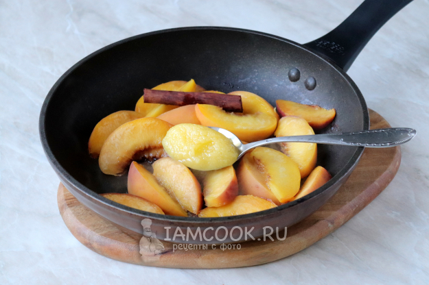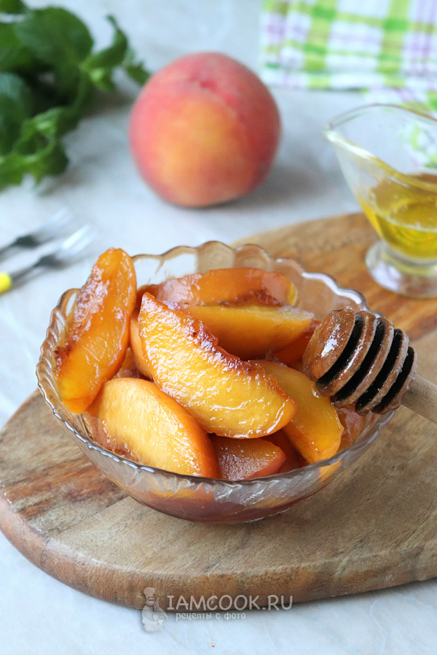 Накрыть сковороду крышкой, довести жидкость до кипения и дать персикам пропариться в течение 2-3 минут, за это время они должны стать немного мягче, но при этом сохранить свою целостность. Затем добавить к ним ложку мёда.