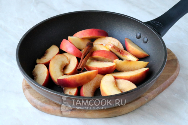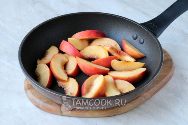 Затем переложить дольки персиков на сковороду или в кастрюлю с толстым дном.