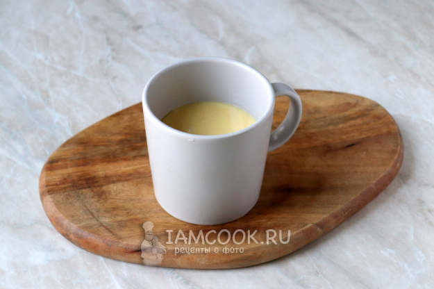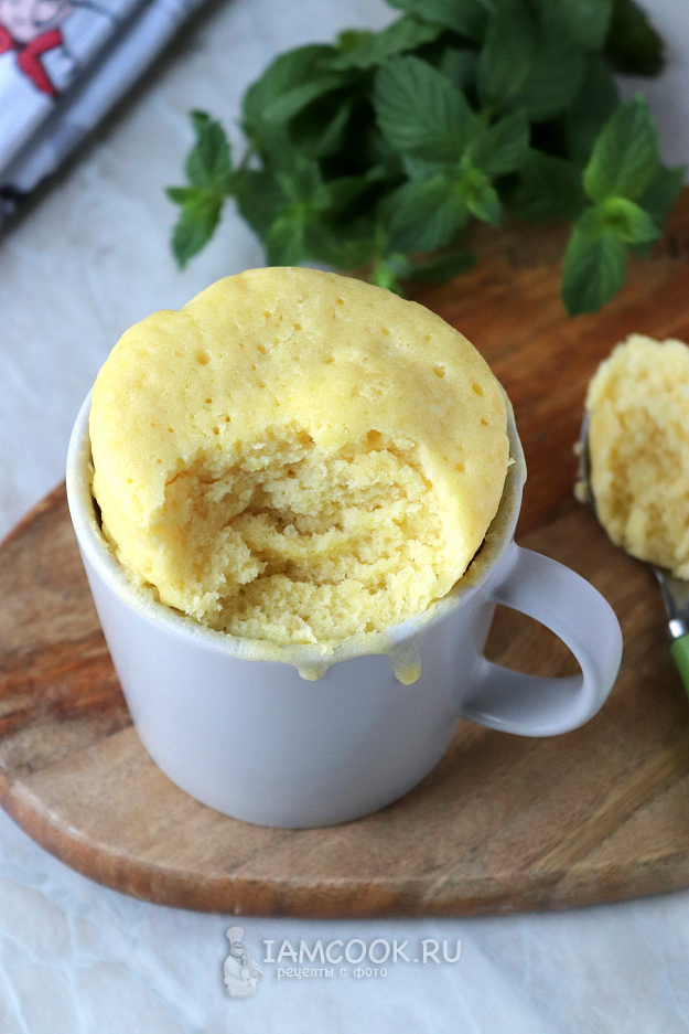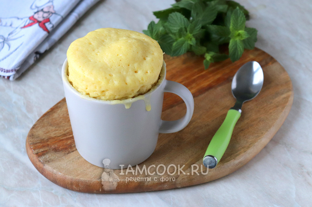 Внутри кружку смажьте тонким слоем растительного или сливочного масла и перелейте туда тесто. Кружка должна быть заполнена тестом наполовину или 3/4 объема, учитывая, что бисквит во время приготовления хорошо подымается.