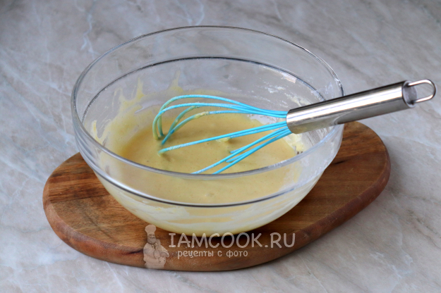 Куриное яйцо вбейте в глубокую миску, добавьте молоко, сахар, рафинированное растительное масло без запаха, разрыхлитель и просеянную пшеничную муку. Венчиком перемешайте массу до однородного состояния. Тесто должно получиться без комочков, средней густоты. Если вы хотите приготовить шоколадный бисквит - добавьте в тесто не 4 столовые ложки муки, а 2 муки и 2 какао-порошка.