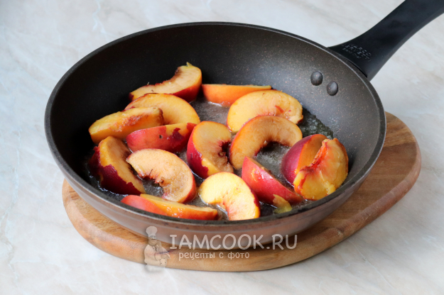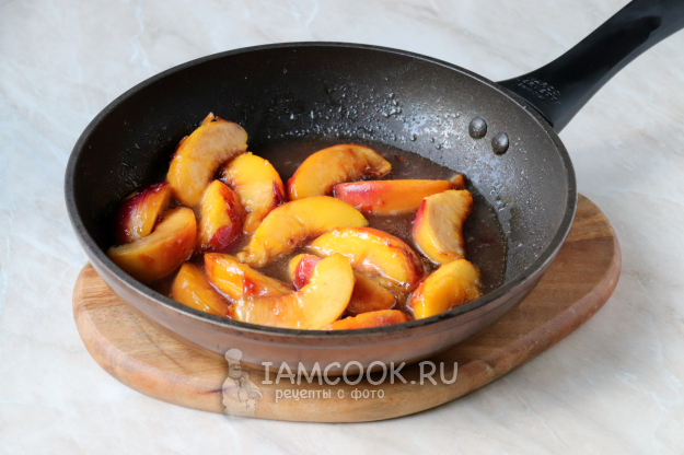 В получившуюся карамель выложите подготовленные дольки персиков.