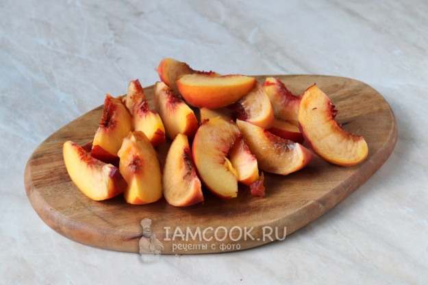 Персики тщательно помойте, удалите косточку, а мякоть нарежьте дольками (как показано на фото).