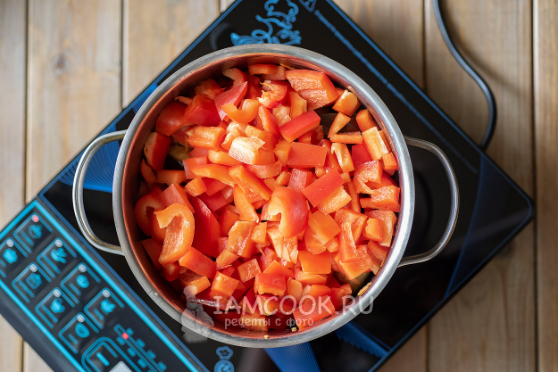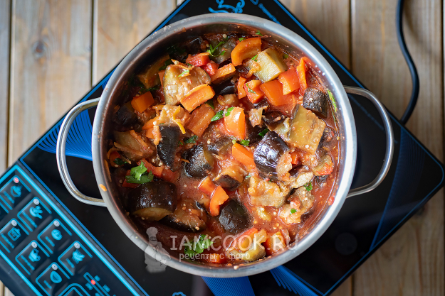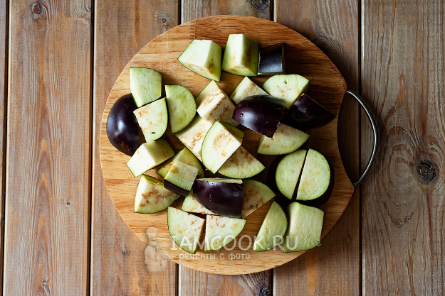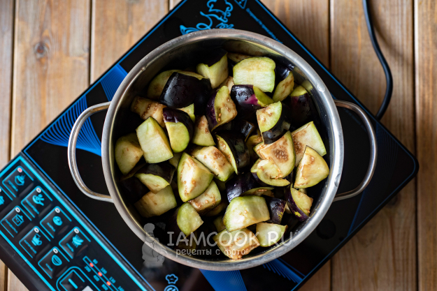В кастрюлю зальем растительное масло и выложим промытые баклажаны, включим средний огонь. Будем обжаривать 10 минут, постоянно помешивая баклажаны деревянной ложкой.