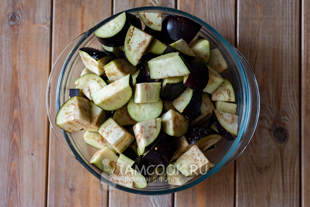 Все кусочки баклажанов выложим в просторную миску и пересыплем солью (2 ч.л.), перемешаем, оставим на 20 минут (это уберет горечь), затем смоем соль, воспользовавшись ситом.