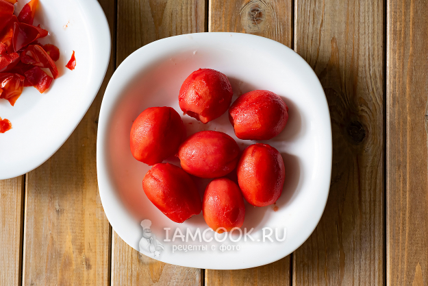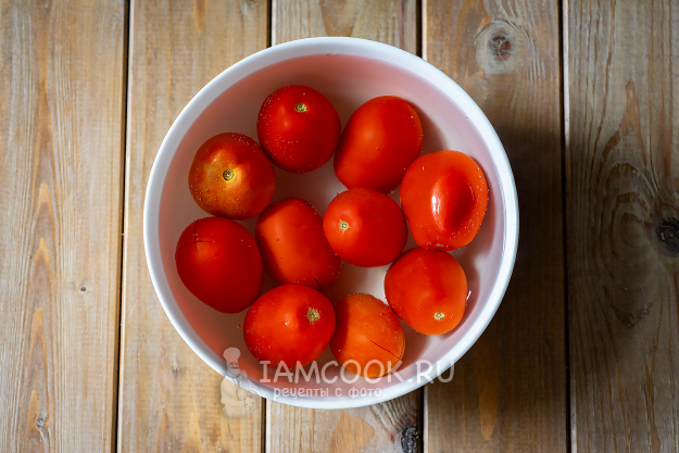Помидоры надрежем крестообразно, выложим в миску и зальем крутым кипятком на 30 секунд.