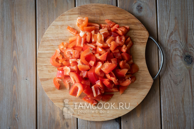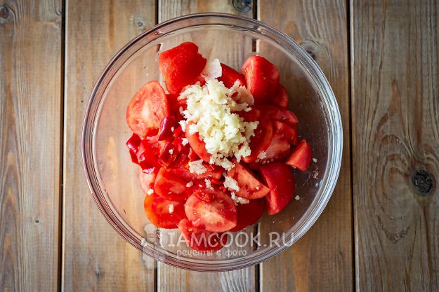 Нарежем помидоры произвольными кусочками прямо в миску, туда же выложим нарезанный перчик чили и выдавим весь чеснок через пресс.