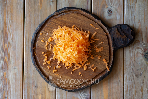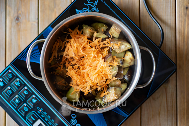 Затем добавим морковь к баклажанам, перемешаем и еще 5 минут обжарим вместе.