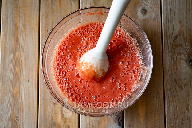 Затем все эти ингредиенты перебьем погружным блендером до получения однородной смеси.