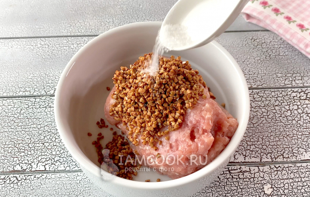 В фарш выложите промытую гречневую крупу. Посолите, поперчите и перемешайте. По желанию добавьте чеснок или репчатый лук.