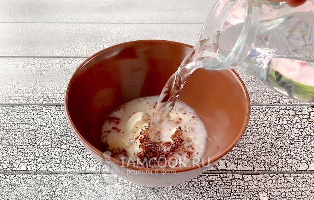 В миску выложите сметану, добавьте специи, соль. Влейте воду и перемешайте.