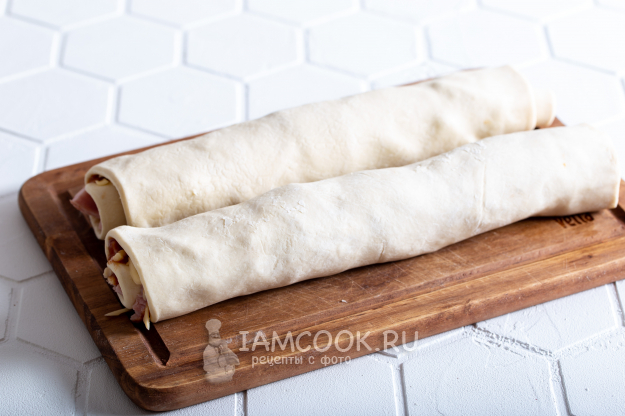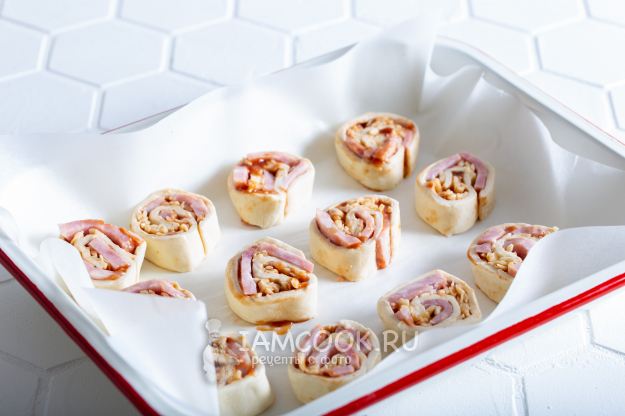 Острым ножом порежьте рулет на кусочки толщиной 1,5-2 см. Форму для запекания или противень выложите бумагой для выпечки. Выложите плюшки на форму и поставьте в предварительно разогретую духовку на 15-20 минут или до румяности. При желании перед выпечкой каждую плюшку можно смазать сырым яйцом.