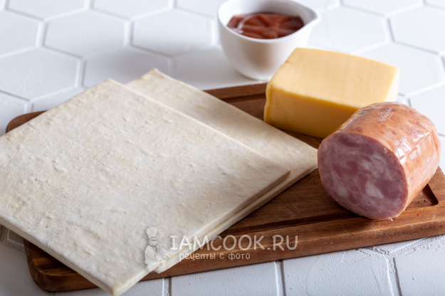 Возьмите указанные ингредиенты для приготовления плюшек с ветчиной и сыром. Ветчину можно взять любую, сыр лучше - полутвёрдый, у меня Гауда, томатный соус можно заменить кетчупом, но чтобы он не был слишком жидким. Включите разогреваться духовку до 200 градусов.