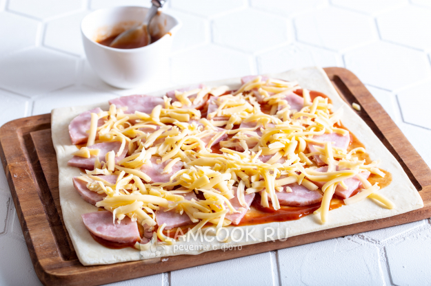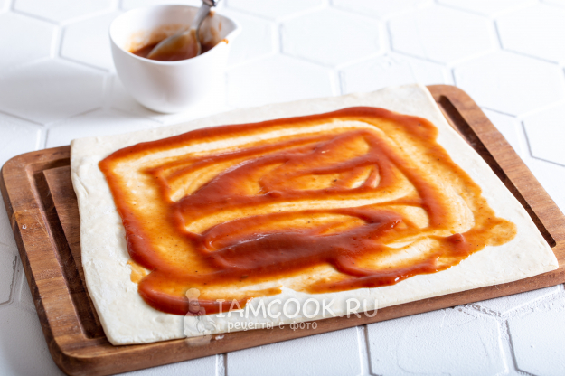 Готовое слоёное тесто разморозьте согласно инструкции на упаковке. Немного раскатайте скалкой (или можно не раскатывать) и равномерно нанесите на него томатный соус, не доходя до краёв пласта.