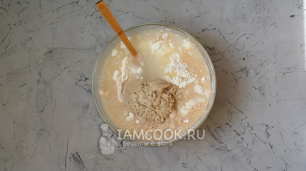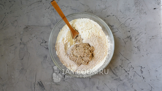 В миску выкладываем пшеничную муку в/с, пшеничную муку ц/з и подошедшую закваску.
