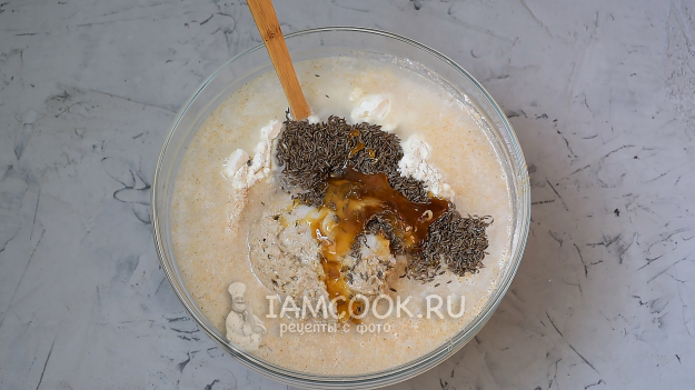 Готовим опару. В миске перемешиваем стартер и воду, добавляем ржаную муку, перемешиваем до полного соединения ингредиентов - получается вязкая, густая масса. Миску с опарой накрываем крышкой или затягиваем пищевой пленкой, оставляем в комнатных условиях на 12-14 часов подходить.