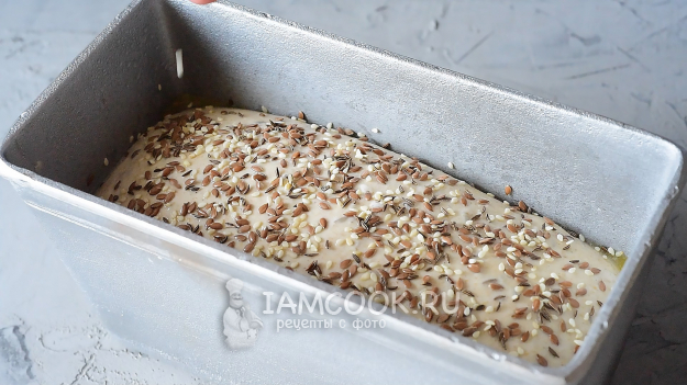 Через 4 часа тесто поднялось. Увлажним с помощью распылителя поверхность теста водой и присыплем семенами льна и кунжута.