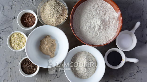 Подготовим необходимые ингредиенты для Польского хлеба на закваске. Ржаная закваска должна быть на пике активности. Экстракт ячменного солода можно заменить на натуральный мед. Пшеничную муку в/с удобнее просеять заранее.
